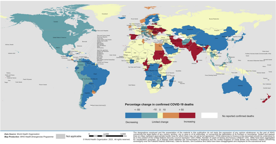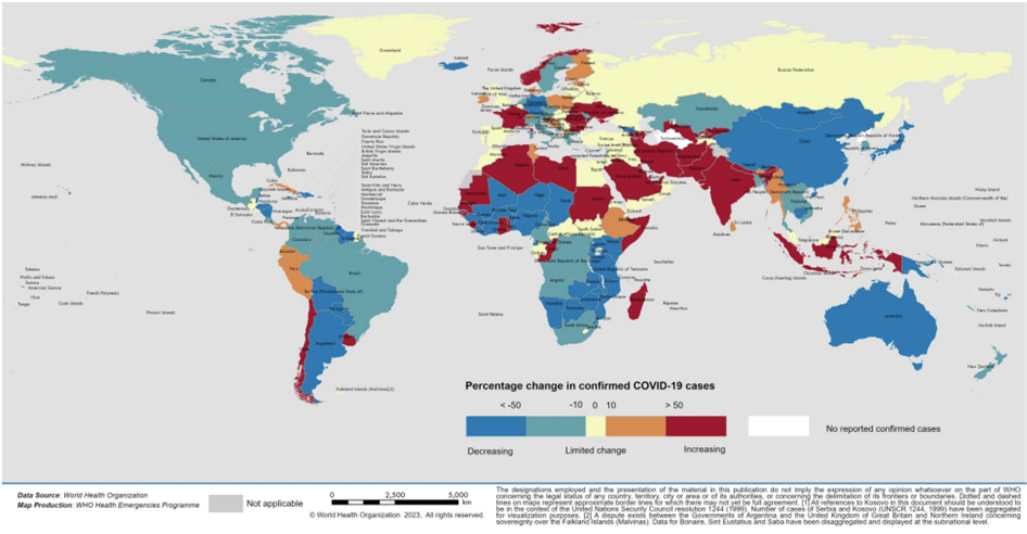 Küresel olarak, son 28 günde (6 Mart - 2 Nisan 2023) yaklaşık 3,3 milyon yeni vaka ve 23.000'den fazla ölüm rapor edildi; önceki 28 güne (6 Şubat - 5 Mart 2023) kıyasla sırasıyla %28 ve %30 düşüş.