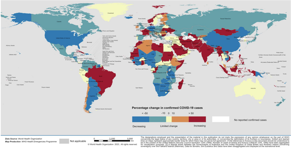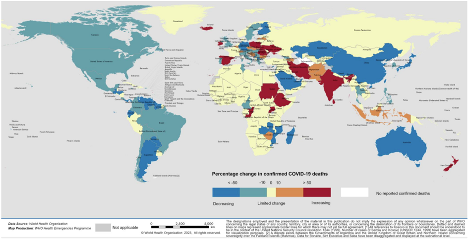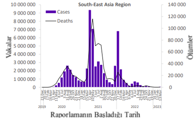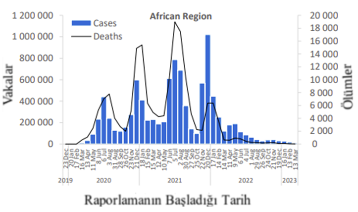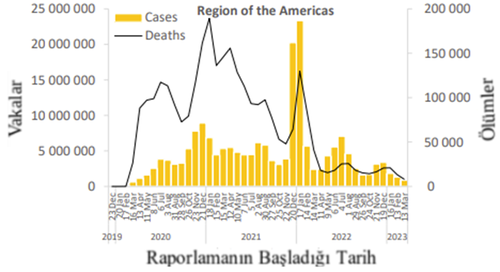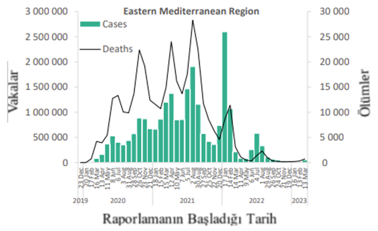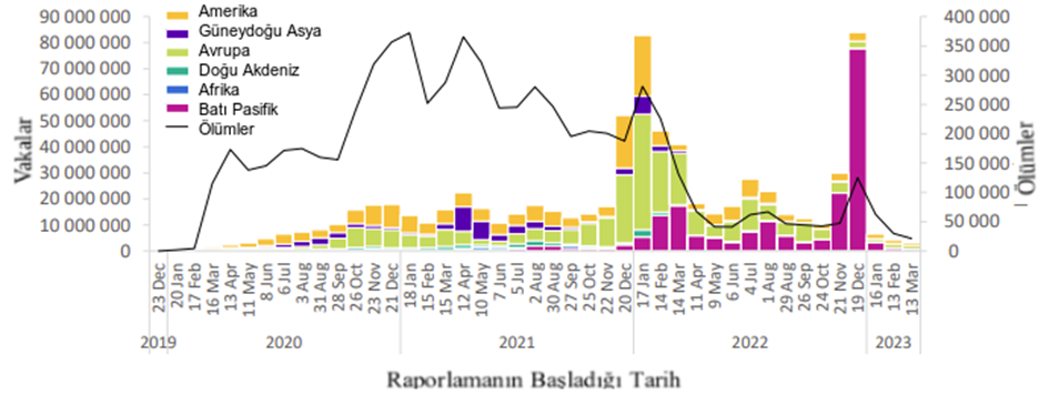Küresel olarak, son 28 gün içinde (13 Mart - 9 Nisan 2023) 3 milyon yeni vaka ve 23.000'den fazla ölüm bildirilmiş olup önceki 28 güne (13 Şubat - 12 Mart) kıyasla sırasıyla %28 ve %30 düşüş 2023) (Şekil 1, Tablo 1) yaşanmıştır. Genel eğilimin aksine, Güneydoğu Asya ve Doğu Akdeniz bölgelerinde ve diğer bazı ülkelerde bildirilen vaka ve ölümlerde önemli artışlar görülmüştür.