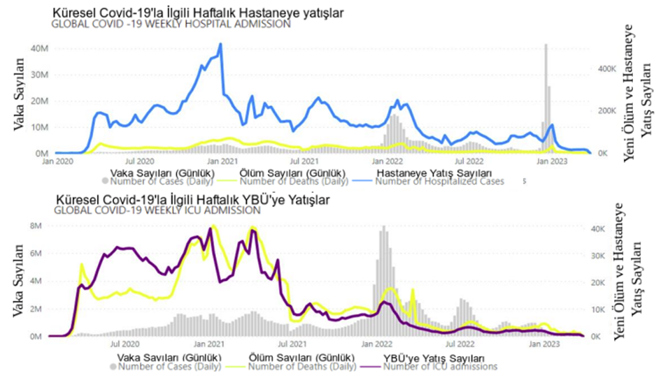 Küresel düzeyde, son 28 gün içinde (6 Mart - 2 Nisan 2023), toplam 69.821 hastaneye yeni yatış ve 2.652 yoğun bakım ünitesine (YBÜ) yeni yatış bildirilmiştir. Bu, önceki 28 güne (6 Şubat - 5 Mart 2023) kıyasla hastaneye yeni yatışlarda %0,2'lik bir artışı ve YBÜ yeni yatışlarında %7'lik bir düşüşü temsil etmektedir. Sunulan hastaneye yatış verileri başlangıç niteliğindedir ve yeni veriler kullanıma sunuldukça değişebilir.
