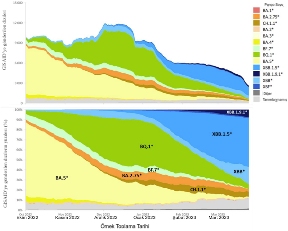 Şekil 5. Grafik A ve B: 1 Ekim 2022 - 25 Mart 2023 tarihleri arasında küresel olarak SARS CoV-2 dizilerinin sayısı ve yüzdesi
