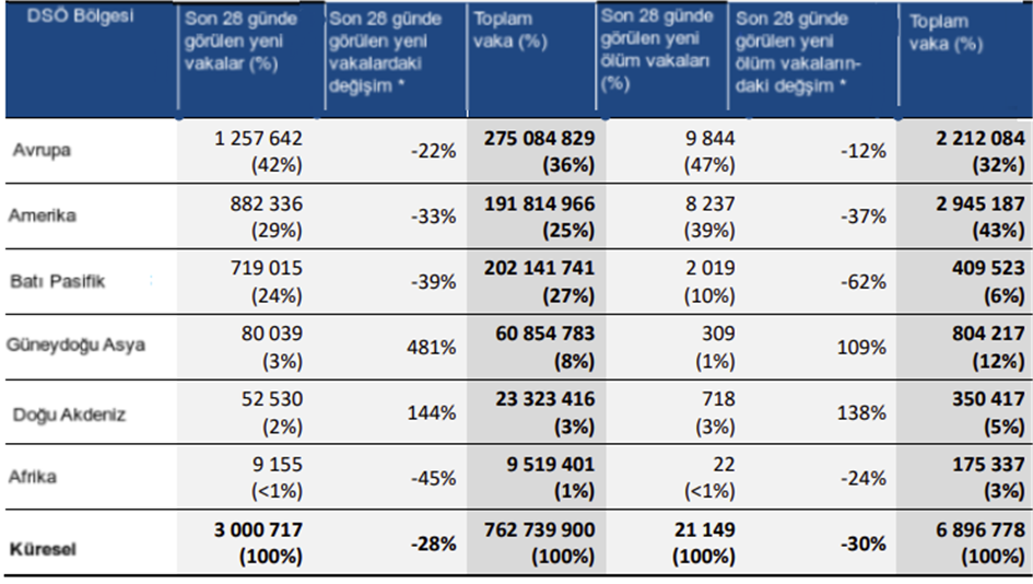 Küresel olarak, son 28 gün içinde bir önceki döneme göre sırasıyla %28 ve %30 düşüş ile 3 milyon yeni vaka ve 23.000'den fazla ölüm bildirilmiştir.