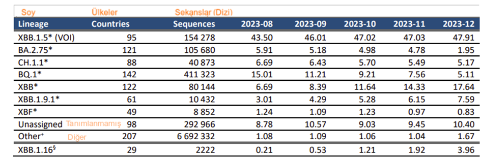 8. haftadan 12. haftaya kadar GISAID'e gönderilen dizilerin karşılaştırması, izleme altındaki varyantlar (VUM'lar) arasında XBB* (XBB.1.5*, XBB.1.16* ve XBB.1.9.1* hariç), XBB.1.9.1 olduğunu göstermektedir. * ve XBB.1.16* artan eğilimler göstermiştir. Bu üç VUM, 8. haftadaki %6.7, %3.0 ve %0.2 ile karşılaştırıldığında, 12. haftada sırasıyla %17.6, %7.6 ve %4.0'ını oluşturuyordu. Diğer VUM'lar aynı dönemde düşüş trendleri gösterdi.