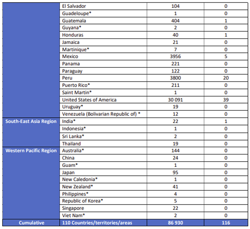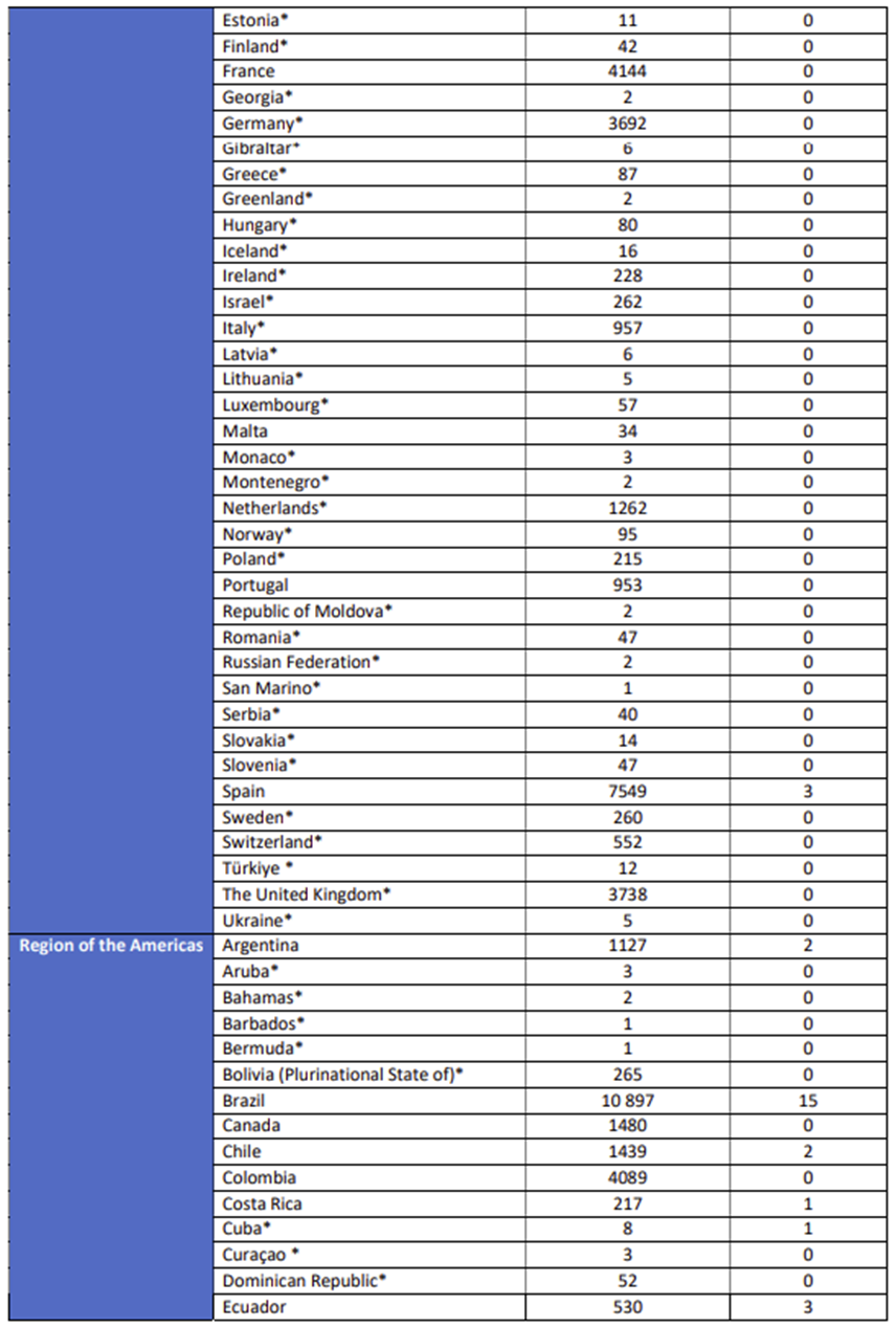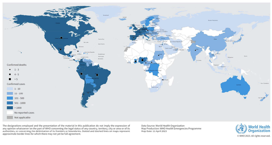 10 Nisan 2023 itibariyle, küresel olarak en yüksek kümülatif vaka sayısını bildiren 10 ülke Amerika Birleşik Devletleri (n = 30.091), Brezilya (n = 10.897), İspanya (n = 7549), Fransa (n = 4144), Kolombiya (n = 4089), Meksika (n = 3956), Peru (n = 3800), Birleşik Krallık (n = 3738), Almanya (n = 3692) ve Kanada (n = 1480) olmaya devam etmektedir. Söz konusu bu ülkeler küresel olarak bildirilen vakaların %84,5'ini oluşturmaktadır.