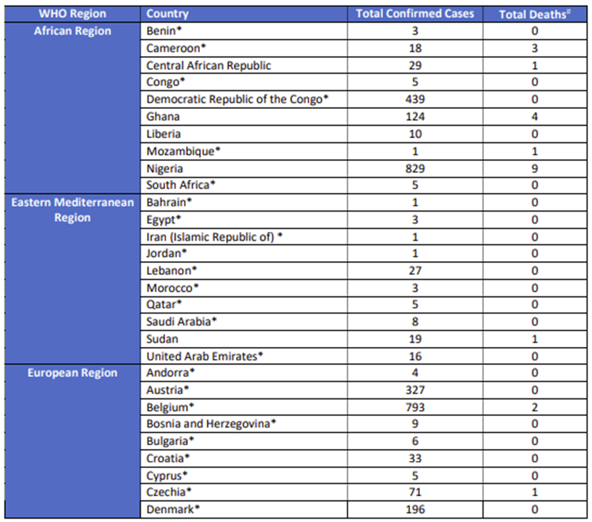Şekil 1'de gösterilen salgın eğrileri, salgının Avrupa ve Amerika Bölgelerinde yavaş yavaş azalmaya devam ettiğini göstermektedir; Afrika Bölgesinde salgın sürmektedir, geçen hafta düşmesine rağmen, Batı Pasifik Bölgesi'nde genel olarak yükselmektedir. İkinci bölgedeki yeni vakaların çoğu Japonya tarafından bildirilirken, Çin ve Kore Cumhuriyeti'nden de birkaç vaka bildirilmiştir. Kalan iki bölge, Güneydoğu Asya ve Doğu Akdeniz, sporadik vakalar bildirmiştir.