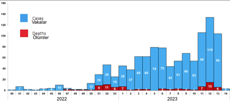 Şekil. 2. 1 Ekim 2022 ile 16 Nisan 2023 arasındaki menenjit vakalarının (n = 1686 şüpheli vaka) haftalık dağılımı