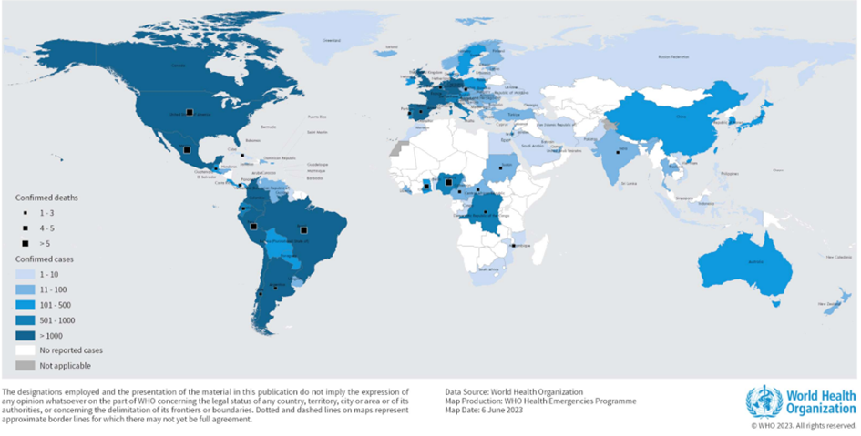 Şekil 2. 1 Ocak 2022 ile 5 Haziran 2023 tarihleri arasında ve saat 17:00 (CEST) itibariyle resmi kamu kaynaklarından DSÖ'ye bildirilen veya DSÖ tarafından tanımlanan doğrulanmış mpox vakalarının coğrafi dağılımı