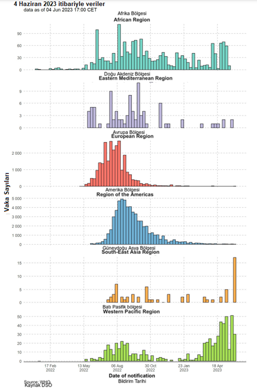 Şekil 1'de gösterilen salgın eğrileri, salgının Avrupa ve Amerika Bölgelerinde düşük bulaşma seviyeleri ile devam ettiğini, Batı Pasifik Bölgesinde son bir hafta içinde hafif düşüş gösterdiğini ve Güneydoğu Asya Bölgesinde vakalarda artış olduğunu göstermektedir. Bulaşmanın daha sürekli olduğu Afrika Bölgesi'nde ise son haftalarda vaka sayılarında artış gözlemlenebiliyor.