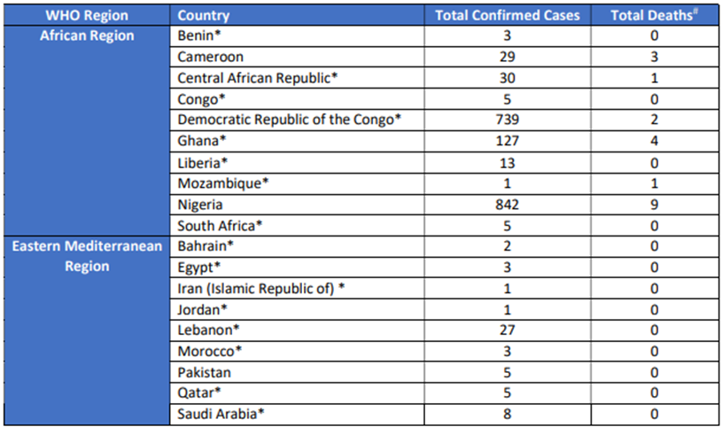 En son raporlama haftasında, hem Avrupa hem de Güneydoğu Asya Bölgelerinden bildirilen vakalarda artış olmuştur. Avrupa'da, İspanya ve Birleşik Krallık ve Güneydoğu Asya'da Tayland tarafından yeni vakalar bildirilmektedir. Bu vakalar geçen hafta bildirilirken bazılarının daha erken teşhis edildiğini ve bu durumun DSÖ'ye bildirimde gecikme olduğunu belirtmek önemlidir. Gecikmeler, diğer bölgelerden gelen verileri de etkiler. Afrika bölgesinde, son haftalarda, özellikle Kamerun, Demokratik Kongo Cumhuriyeti ve Nijerya'dan olmak üzere vakalarda daha önce bildirilen ortalama vaka sayısını aşan bir artış gözlemlemekteyiz.