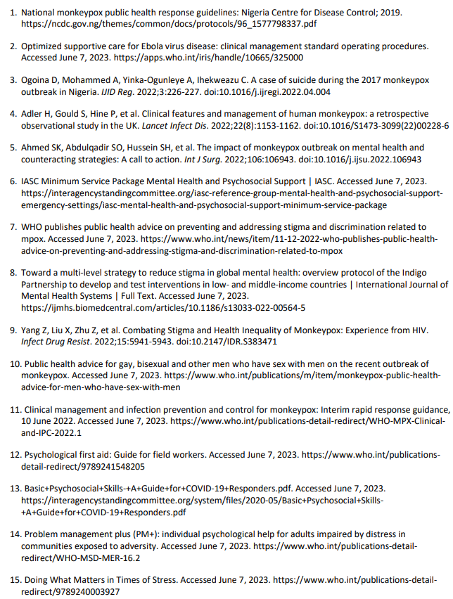 - Multi-country outbreak of mpox, External situation report #15- 2 February 2023: https://www.who.int/publications/m/item/multicountry-outbreak-of-mpox--external-situation-report-15--2-february-2023