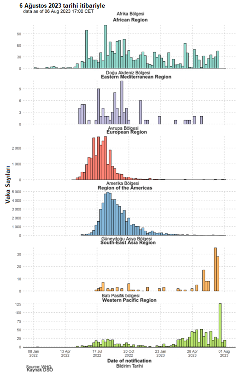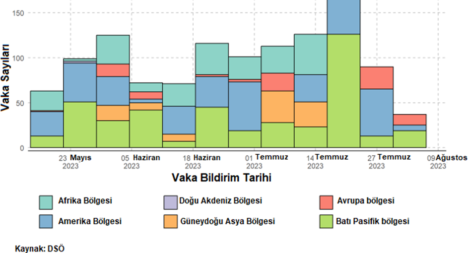 Son üç haftada (17 Temmuz - 8 Ağustos 2023) (n=158 / 293; %77,2) vakaların çoğunu Batı Pasifik Bölgesi rapor etmiştir.