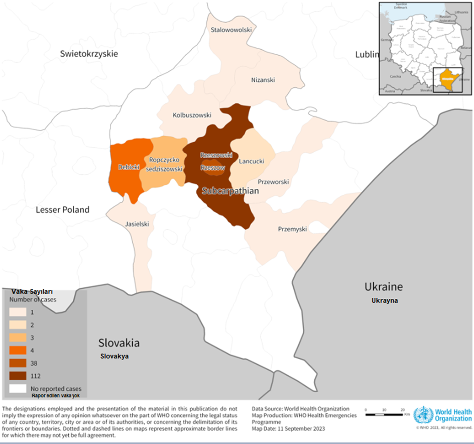 18 Ağustos ile 11 Eylül 2023 tarihleri arasında tamamı hastaneye kaldırılan toplam 166 laboratuvarca doğrulanmış vaka ve ilişkili 23 ölüm (%14 CFR) rapor edilmiştir. Vakaların çoğu , %67'si (n=112) Rzeszów şehrinde, vakaların %23'ü (n=38) Rzeszów ilçesinde ve vakaların %10'u (n=16) diğer yerlerde kaydedilmiştir.