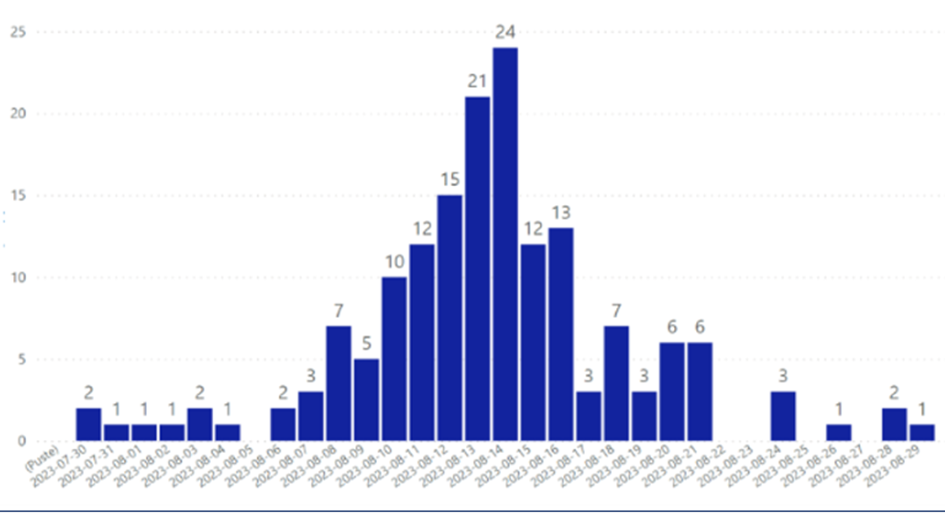 Devam eden bir epidemiyolojik araştırmadan elde edilen ilk sonuçlar, ilk vakaların 30 Temmuz'da semptomlar geliştirdiğini, çoğu vakanın ise 12-16 Ağustos tarihleri arasında semptomlar geliştirdiğini göstermektedir. Yaşları 60 ila 90 arasında değşen yetişkinler en çok etkilenen yaş grubudur. En son bildirilen vakanın başlangıç tarihi 29 Ağustos'tur. İlgili 23 ölümün tamamında altta yatan ek hastalıklar var olup yaşları 53 ile 98 arasında değişmektedir (11 kadın ve 12 erkek).