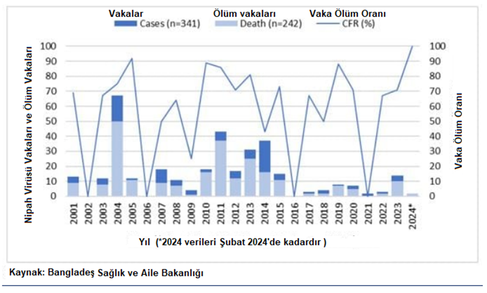 Şekil 1. Bangladeş’te 1 Ocak 2001 - 9 Şubat 2024 tarihleri arasında yıllara göre bildirilen Nipah virüsü vaka ve ölüm vakası sayısı