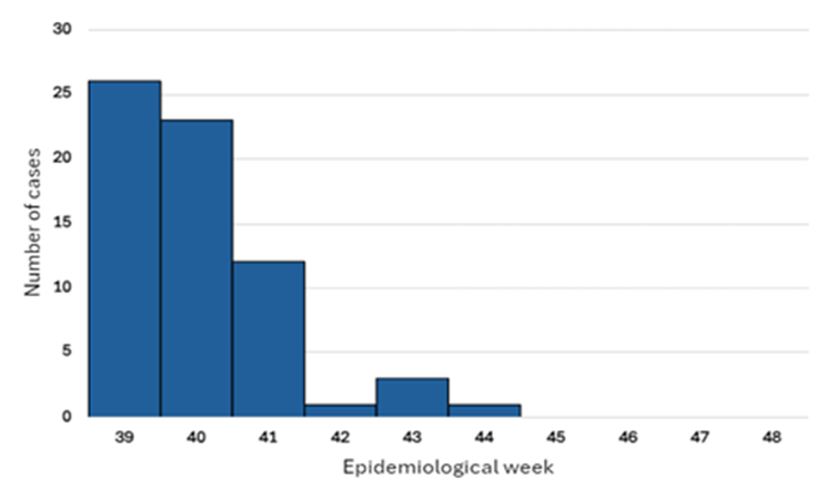 En yüksek sayıda teyit edilmiş vaka (61) salgının ilk üç epidemiyolojik haftasında (39’uncu-41’inci hafta, 23 Eylül - 13 Ekim arası) bildirilmiştir. Bunu keskin bir düşüş izlemiş, 42’nci (14-20 Ekim) ve 44’üncü (28 Ekim-3 Kasım) epidemiyolojik haftalar arasında üç veya daha az vaka bildirilmiştir. Teyit edilen son vaka 30 Ekim'de, son ölüm ise 14 Ekim 2024'te bildirilmiştir.