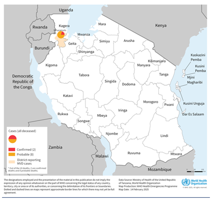 Tanzanya'da 20 Ocak 2025 tarihinde Marburg Virüsü Hastalığı (MVD) salgınının ilan edilmesinden bu yana, Sağlık Bakanlığı tarafından salgının merkez üssü olan Kagera bölgesindeki Biharamulo ilçesinden bir doğrulanmış ölüm daha bildirilmiştir. 10 Şubat 2025 itibariyle, Sağlık Bakanlığı tarafından kümülatif olarak iki doğrulanmış ve sekiz olası vaka bildirilmiştir. Sekizi salgının teyit edilmesinden önce ölenler olmak üzere 10 vakanın tamamı ölmüştür. 10 Şubat 2025 itibariyle, listede yer alan ve izleme altında olan 281 temaslının tamamı 21 günlük takibi tamamlamıştır. Sağlık Bakanlığı, faaliyetleri yönlendirmek için ulusal bir müdahale planı geliştirmiştir. Ayrıca, DSÖ ve sağlık ortaklarının teknik ve operasyonel desteği ile salgın araştırmasını ve müdahalesini geliştirmek için etkilenen bölgeye ulusal bir hızlı müdahale ekibi konuşlandırılmıştır.