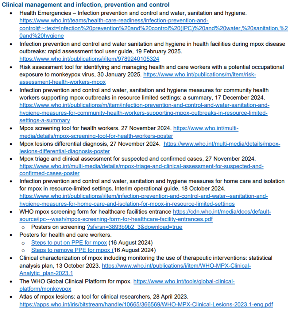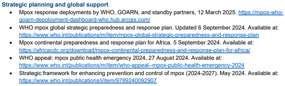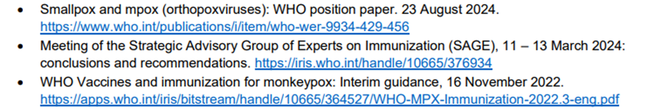 Referans amacıyla, Şubat 2025'te yapılan en son DSÖ küresel mpox hızlı risk değerlendirmesinin bir özeti Ek 1'de bulunabilir.