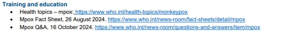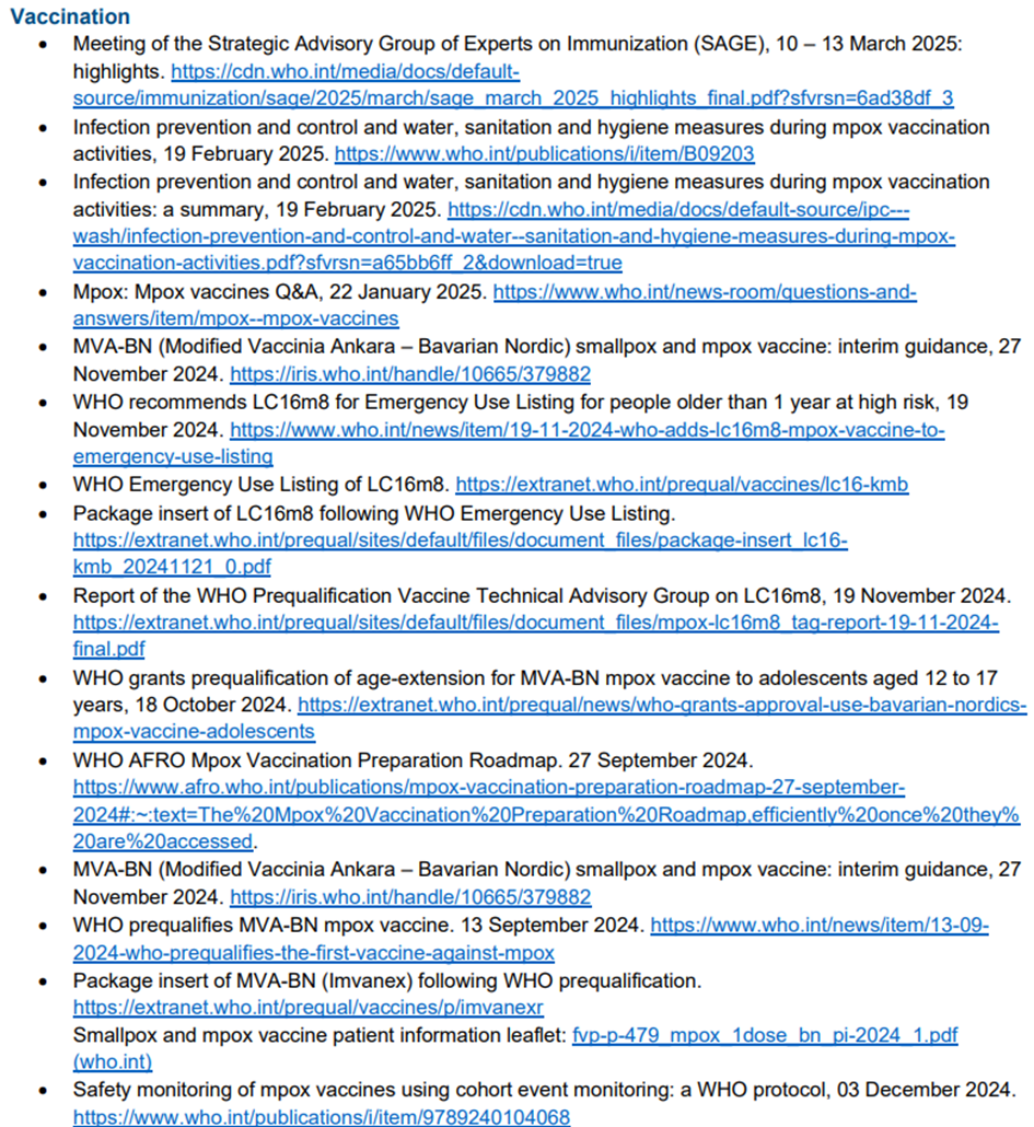 - DSÖ, Afrika kıtasındaki mpox vakalarındaki artışın kontrol altına alınmasını desteklemek amacıyla, risk grubundaki etkilenen ülkelerde mpox aşısının uygulanmasını ve kullanımını hızlandırmak için teknik destek sağlamaya devam etmektedir.