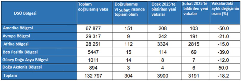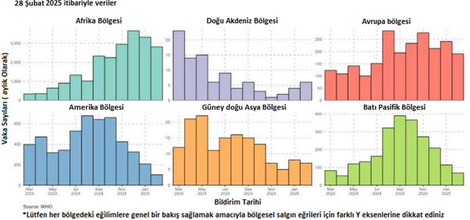 - Küresel mpox epidemiyolojik durumu, 28 Şubat 2025 itibariyle; küresel sürveyans verileri aylık olarak özetlenmektedir; Şubat 2025, tam verilerin mevcut olduğu son aydır;