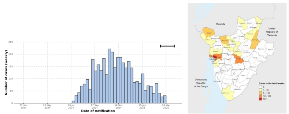 Temmuz 2024'te başlayan mpox salgınından 2 Mart 2025'e kadar Burundi, bir ölüm (CFR 0,03%) dahil olmak üzere 3645 doğrulanmış mpox vakası bildirmiştir. Ülke toplum içi bulaşma yaşamakta olup ulusal vaka sayısı, haftada 200'den fazla yeni doğrulanmış vaka (sol, Şekil 10) ve o zamandan beri istikrarlı bir düşüşle Ekim 2024'te zirveye ulaşmıştır. Son haftalarda, sürveyanstaki bazı açıklar bağlamında bildirilen vaka sayısı haftada 50 vakadan az olmuştur.