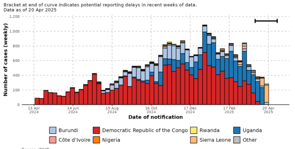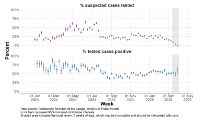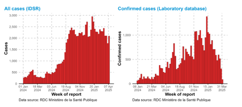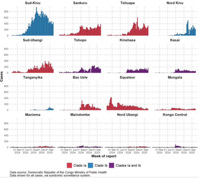 - Kongo Demokratik Cumhuriyeti, son haftalarda bildirilen doğrulanmış vaka sayısının azalmasına rağmen, muhtemelen test ve doğrulama kapasitesindeki azalma nedeniyle, 2025 yılında Afrika'daki en yüksek kümülatif doğrulanmış mpox vakası sayısını bildirmektedir. Klad Ia ve Ib MPXV ülkede dolaşımdadır.