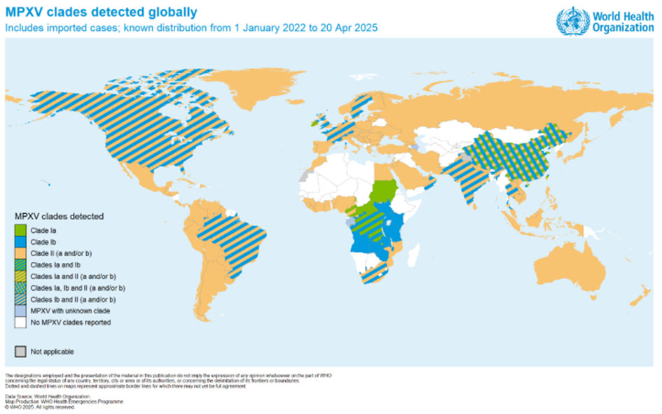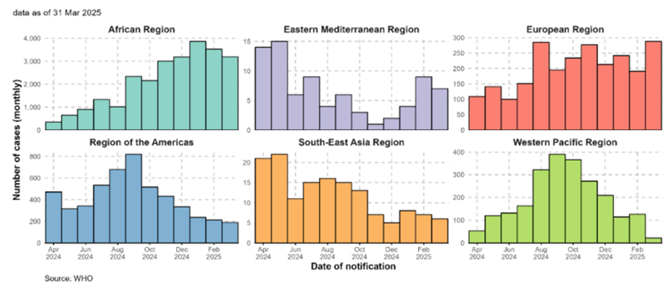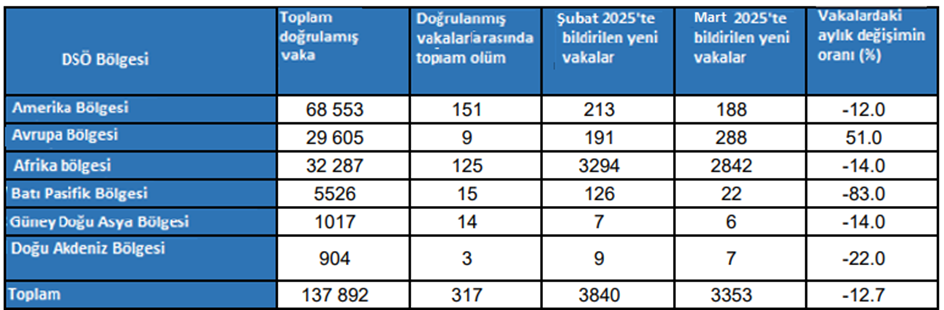 - 31 Mart 2025 itibarıyla mpox için küresel epidemiyolojik durum;