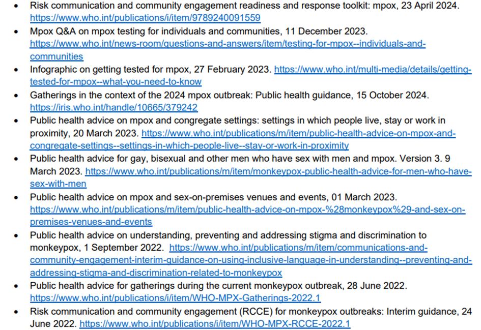 Referans amaçlı olarak, Şubat 2025'te gerçekleştirilen en son DSÖ küresel mpox hızlı risk değerlendirmesinin bir özeti Ek 1'de bulunabilir.