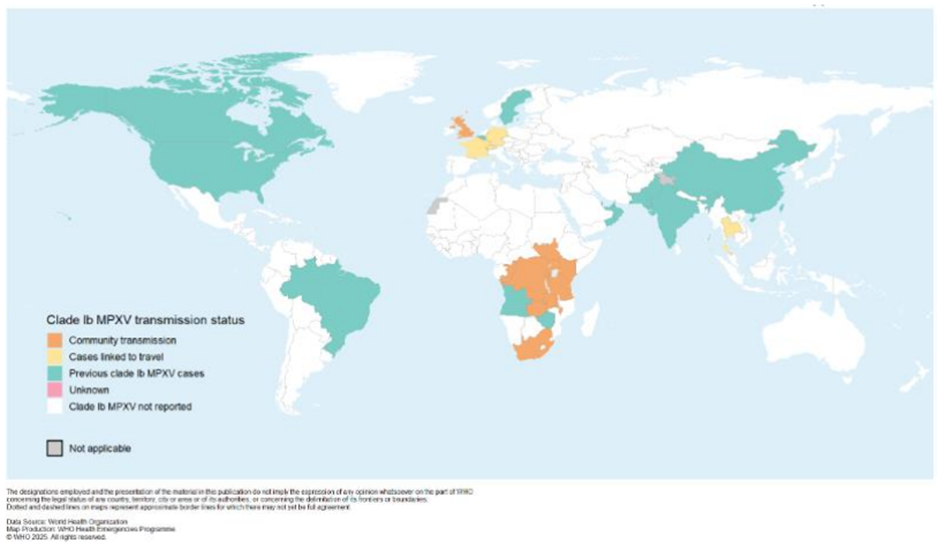 - Klad Ib MPXV - Çoğunlukla Kongo Demokratik Cumhuriyeti ve komşu ülkelerdeki mpox için endemik olmayan bölgeleri etkilemektedir ve mpox esas olarak cinsel temas da dahil olmak üzere insandan insana yakın fiziksel temas yoluyla yayılmaktadır. Uluslararası yayılım ağırlıklı olarak cinsel temasla bağlantılıdır: Yüksek.