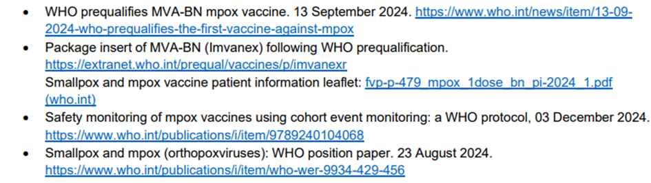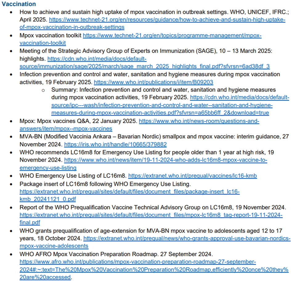 - Aşılama faaliyetleri yedi ülkede (Orta Afrika Cumhuriyeti, Kongo Demokratik Cumhuriyeti, Liberya, Nijerya, Ruanda, Sierra Leone ve Uganda) başlamıştır. Aşı tahsisi isteyen diğer ülkeler ulusal mpox aşılama planlarını hazırlamaktadır.
