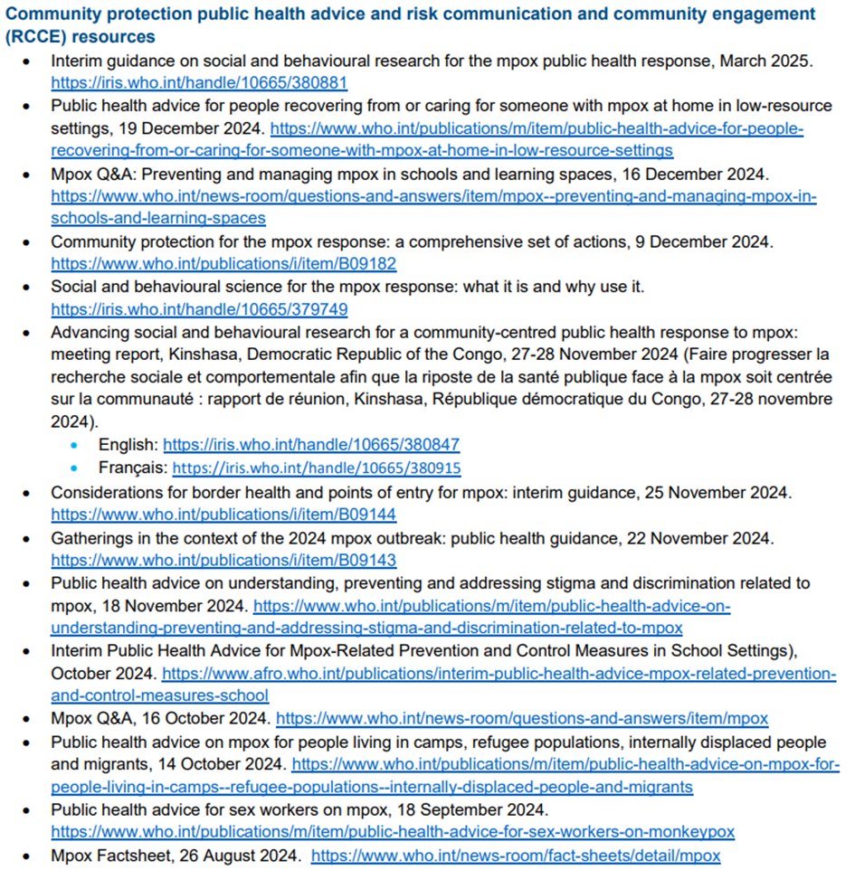 - DSÖ, 9 Nisan 2025 tarihinde bir EPI-WIN web semineri düzenlemiştir: Etki için kanıt - mpox'a toplum merkezli bir yanıtın ilerletilmesi, mpox halk sağlığı yanıtı için sosyal ve davranışsal araştırmalara ilişkin geçici kılavuzun lansmanı, Mart 2025. Bu geçici kılavuz türünün ilk örneğidir ve acil bir müdahalede bu tür kanıtların üretilmesinin kalitesini, etiğini ve etkisini güçlendirmek için geliştirilmiştir. Kılavuz şu anda İngilizce ve Fransızca dillerinde mevcuttur. Kılavuzun uygulanmasına yönelik operasyonel destek araçları takip eden hafta içinde sahada test edilmiştir.