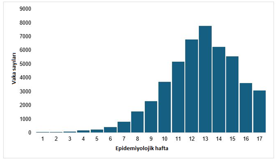 Şekil 1: 1 Ocak - 27 Nisan 2025 tarihleri arasında Reunion'da teyit edilen chikungunya vakalarının sayısının semptomların başladığı haftaya göre epidemiyolojik eğrisi