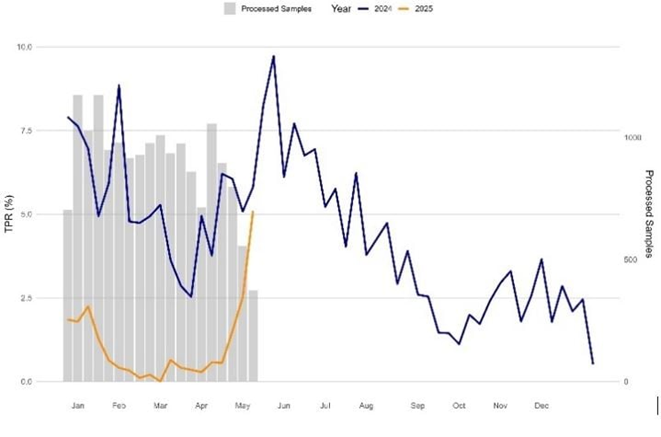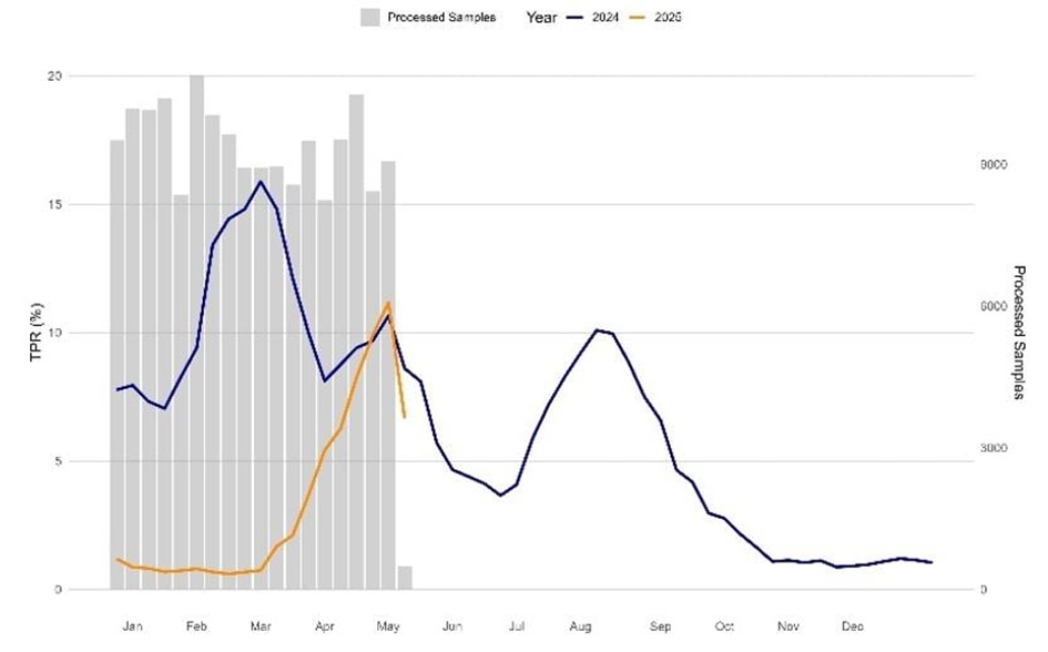 Batı Pasifik Bölgesinde, sentinel sürveyans verileri on ülke ve bölge tarafından 2025 yılında sentinel sahalardan elde edilen test pozitiflik oranları aracılığıyla rapor edilmiştir. Geçtiğimiz ay, test pozitiflik oranı Epidemiyolojik Hafat- EW14'te %5 iken EW19'da %11'e yükselmiştir. Yılın ilk on haftasındaki düşük sirkülasyonun ardından, keskin bir yükseliş eğilimi geçen yılla benzer seviyelere ulaşmıştır (EW18 2024'te %10). Son artışlar bugüne kadar dört ülke ve bölgede gözlemlenmiştir: Kamboçya, Çin, Hong Kong SAR ve Singapur.