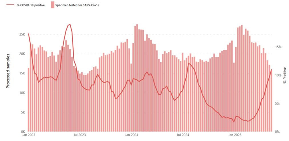 Küresel İnfluenza Sürveyans ve Yanıt Sistemi'ne (GISRS) sentinel sürveyans bölgelerinden bildirilen SARS-CoV-2 verilerine dayanarak, küresel olarak SARS-CoV-2 aktivitesinde bir artış olmuştur. 11 Mayıs 2025 itibariyle test pozitiflik oranı, raporlama yapan 73 ülke, bölge ve yönetim bölgesinde %11'dir. Bu seviye Temmuz 2024'te (99 ülkeden %12) gözlemlenen zirve ile eşleşmekte ve Şubat 2025 ortalarında 110 ülke tarafından bildirilen %2'lik orandan bir artışa işaret etmektedir (Şekil 1). Test pozitiflik oranındaki artış esas olarak Doğu Akdeniz Bölgesi, Güneydoğu Asya Bölgesi ve Batı Pasifik Bölgesi'ndeki ülkelerden kaynaklanmaktadır.
