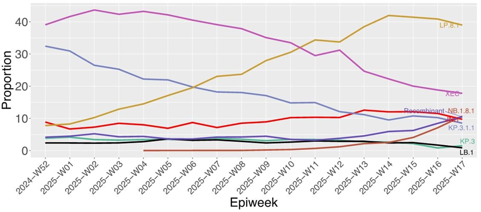 SARS-CoV-2 gelişmeye devam etmektedir ve Ocak ile Mayıs 2025 arasında küresel SARS-CoV-2 varyant dinamiklerinde değişimler yaşanmıştır. Yılın başında, DSÖ tarafından küresel düzeyde izlenen en yaygın varyant XEC olup onu KP.3.1.1 izlemiştir. Şubat ayında, XEC'in dolaşımı azalmaya başlarken LP.8.1'in dolaşımı artmış ve Mart ortasında en çok tespit edilen varyant haline gelmiştir. Nisan ortasından bu yana, NB.1.8.1'in giderek daha fazla tespit edilmesiyle LP.8.1'in dolaşımı hafifçe azalmaktadır.