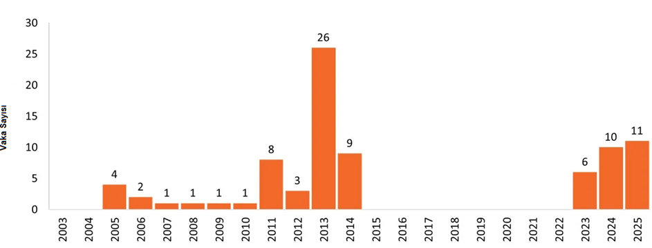 Şekil 1: 2003 - 1 Temmuz 2025 tarihleri arasında Kamboçya'da yıllara göre bildirilen Avian İnfluenza A (H5N1) vakalarının epidemiyolojik eğrisi