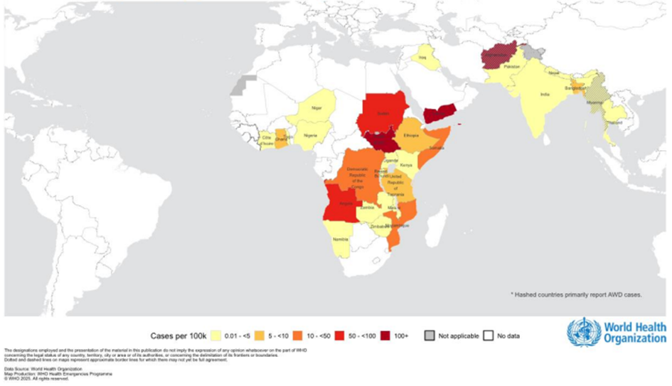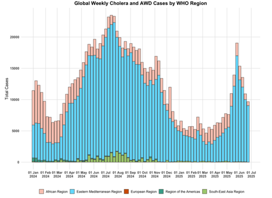 1 Ocak 2025 ile 29 Haziran 2025 tarihleri arasında, üç DSÖ bölgesinde toplam 305.903 kolera vakası ve 3.522 ölüm bildirilmiştir. En yüksek vaka sayısının bildirildiği bölge Doğu Akdeniz Bölgesi (159.414 vaka; altı ülke) olmuş, bunu Afrika Bölgesi (143.762 vaka; 19 ülke) ve Güneydoğu Asya Bölgesi (2.727 vaka; beş ülke) takip etmiştir. Bu dönemde, Afrika Bölgesi'nde (2.928 ölüm), Doğu Akdeniz Bölgesi'nde (593 ölüm) ve Güneydoğu Asya Bölgesi'nde (bir ölüm) kolera kaynaklı ölümler bildirilmiştir.