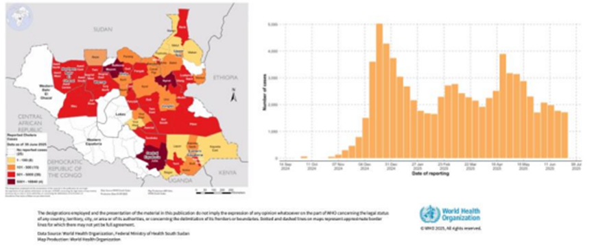 2025 yılının Haziran ayında Güney Sudan, 7.577 yeni kolera vakası ve 77 ilgili ölüm bildirmiş olup, ölüm oranı %1 olarak kaydedilmiştir. Bu rakamlar, 2025 yılının Mayıs ayına kıyasla vakalarda %25, ölümlerde ise %38 azalma olduğunu göstermektedir.