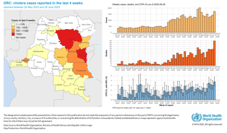 Haziran 2025'te Kongo Demokratik Cumhuriyeti 5.715 yeni kolera vakası ve 193 kolera kaynaklı ölüm bildirmiştir. Ölüm oranı %3,4 olarak kaydedilmiştir. Söz konusu rakamlar, Mayıs 2025'e kıyasla vakalarda %2'lik bir azalma ve ölümlerde %58'lik bir artışa işaret etmektedir.