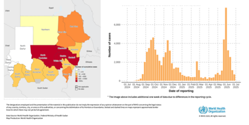 Şekil 7. Sudan: 29 Haziran 2025 itibariyle eyaletlere göre 100 000 nüfus başına vaka dağılımı (Sol) ve haftalık vaka eğilimi (Sağ),