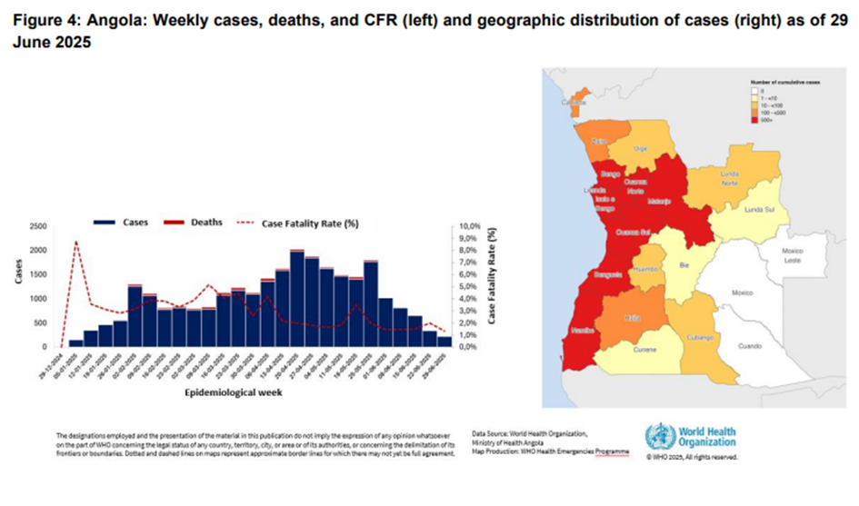 Şekil 4. Angola: 29 Haziran 2025 itibariyle haftalık vaka ve ölüm eğilimi (Solda) ve vakaların coğrafi dağılımı (Sağda)
