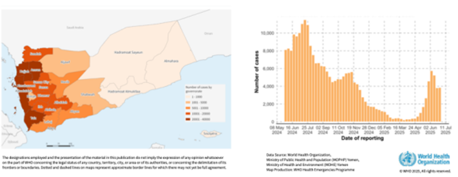 Şekil 8: Yemen: 29 Haziran 2025 itibarıyla eyaletlere göre 100.000 nüfus başına vaka dağılımı (solda) ve haftalık vaka eğilimi (sağda).