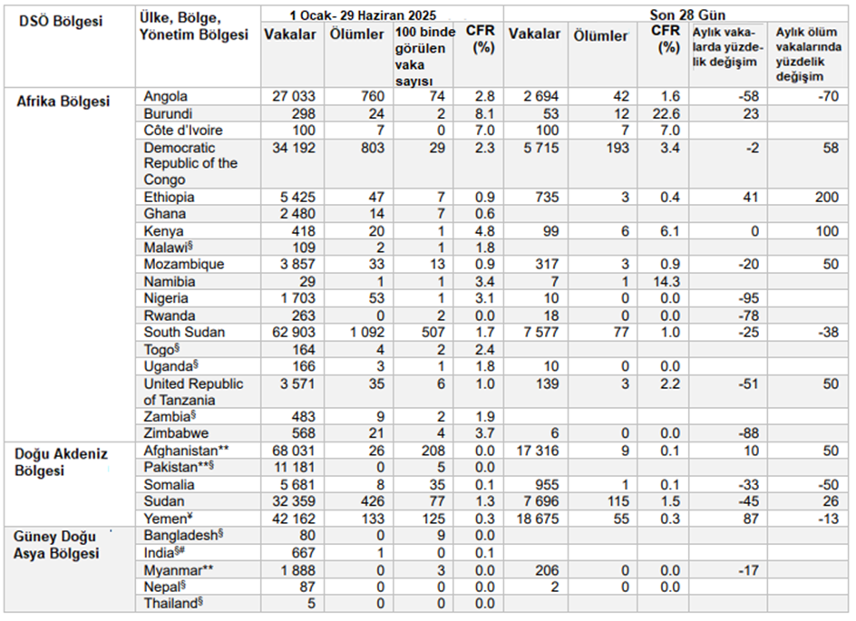 - Haziran 2025'te, 21 ülkede 78.403 vaka ve 381 kolera kaynaklı ölümün bildirildiği Haziran 2024'e kıyasla kolera vaka sayısı %21 daha düşük, ölüm sayısı ise %38 daha yüksek olduğu görülmüştür.