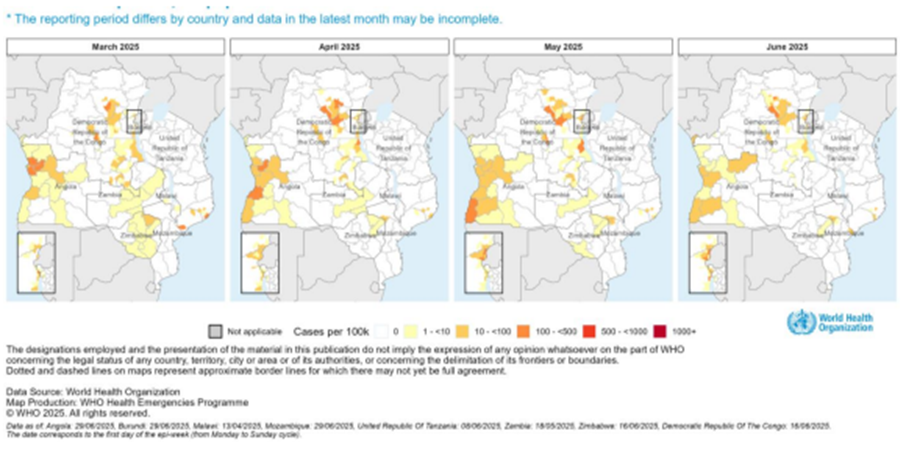 Haziran 2025'te Angola, 2694 yeni kolera vakası ve 42 ölüm (CFR = 1,6) bildirmiş olup, Mayıs ayına kıyasla vakalarda %58, ölümlerde ise %70'lik bir düşüşe işaret etmektedir.