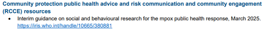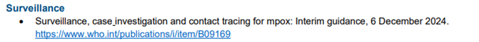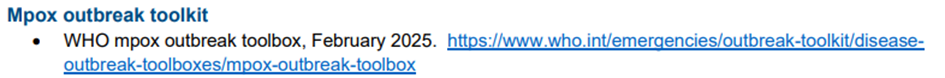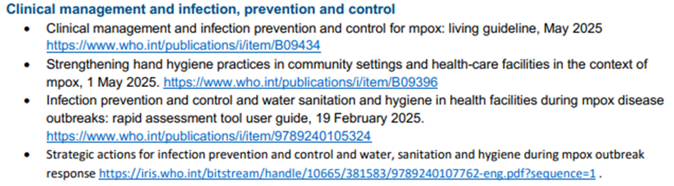 - DSÖ, MPOX halk sağlığı müdahalelerinde ve diğer sağlık acil durumlarında toplum korumasına yönelik normatif rehberliği geliştirmek üzere 29 Temmuz 2025 tarihinde uzman bir teknik çalışma grubu oluşturmuştur.