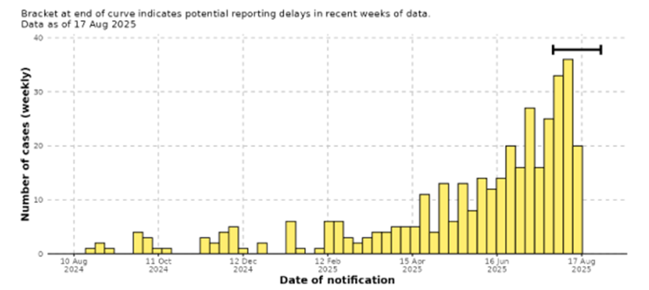 Şekil 7. Kenya'da son 12 ayda bildirilen doğrulanmış mpox vakaları, 10 Ağustos 2024 - 17 Ağustos 2025.