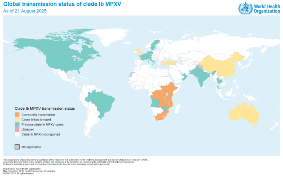 - Birleşik Krallık: Birleşik Krallık, 21 Ağustos 2025'te, yakın zamanda Tanzanya’ya seyahat öyküsü olan yetişkin bir erkek gezginde Ib MPXV kladından kaynaklanan bir mpox vakasını DSÖ'ye bildirmiştir. Ülkedeki sağlık yetkilileri temas takibi yapmış, temaslılara uygun halk sağlığı tavsiyelerinde bulunmuş, aşılanmaya durumu uygun olanlara aşılanmalarını önermiş olup temaslıları mpox semptomları açısından izlemektedir.