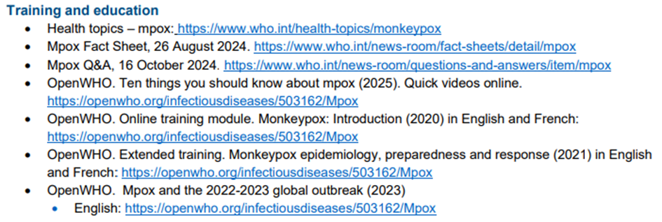 Mpox kaynaklarının daha kapsamlı bir listesine buradan ulaşabilirsiniz.