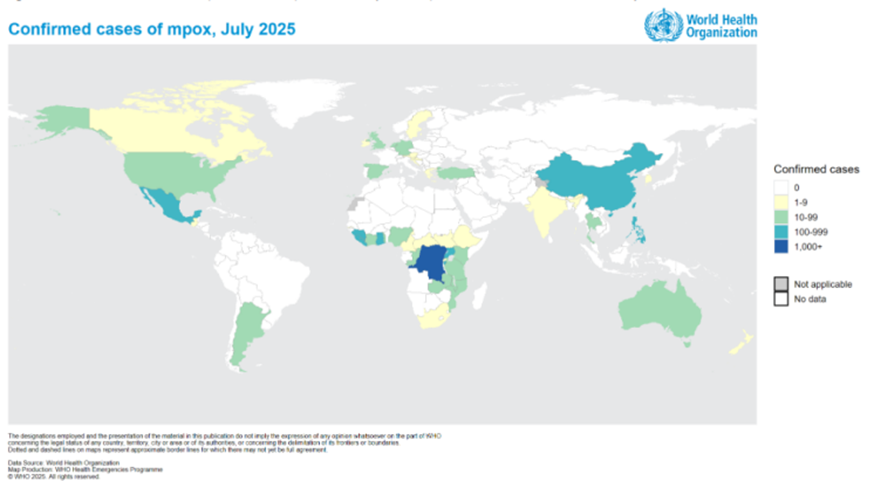 Küresel sürveyans aylık olarak güncellenmekte olup en son veriler 31 Temmuz 2025 tarihi itibarıyla mevcuttur. Temmuz 2025'te, DSÖ'nün altı bölgesinden beşindeki 47 ülke, 30 ölüm de dahil olmak üzere toplam 3924 doğrulanmış vaka bildirmiştir (Şekil 3).