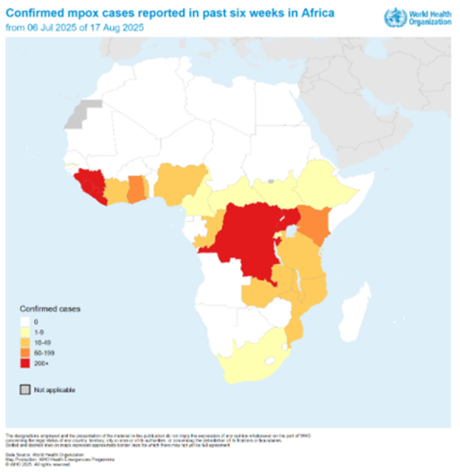 1 Ocak - 6 Temmuz 2025 tarihleri arasında Afrika'daki 21 ülke, 115 ölüm dahil olmak üzere 26.734 doğrulanmış mpox vakası bildirmiştir (CFR %0,4). Kıtadaki on dokuz ülke son altı hafta içinde aktif mpox bulaşının devam ettiğini bildirmiştir (Şekil 3).