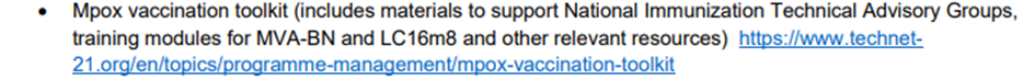 - Mpox aşılama faaliyetleri, MVA-BN aşısı bulunan sekiz ülkede (Orta Afrika Cumhuriyeti, Demokratik Kongo Cumhuriyeti, Liberya, Nijerya, Ruanda, Sierra Leone, Güney Afrika ve Uganda) başlamıştır. Bu ülkelerin çoğu, yüksek maruz kalma riski taşıyan nüfus gruplarını hedefleyen tek doz stratejisi uygulamaktadır. Aşılananların %69'undan fazlasını oluşturan Kongo Demokratik Cumhuriyeti'nde 986.000'den fazla MVA-BN aşı dozu ve 28.000'den fazla LC16 dozu uygulanmıştır. Son zamanlarda mpox vakası bildiren diğer ülkeler, ulusal mpox aşılama planlarını geliştirmekte olup MVA-BN aşısının kesirli doz/intradermal uygulamasını benimsemeleri teşvik edilmektedir. Üreticilerden ek aşı tedariki sağlamak için acilen finansmana ihtiyaç duyulmaktadır.
