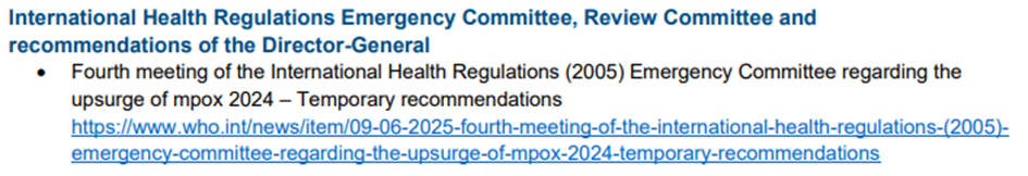 - 20 Ağustos 2025 tarihinde, DSÖ Genel Direktörü, mpox'un uluslararası yayılımını ve sağlık üzerindeki etkisini daha fazla önlemek veya azaltmak amacıyla, Taraf Devletlere verilen Mpox'a ilişkin daimi tavsiyeleri 20 Ağustos 2026 tarihine kadar 12 ay uzatmıştır.